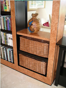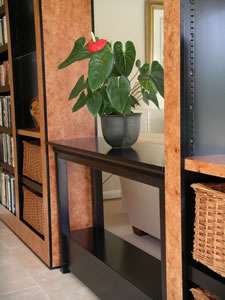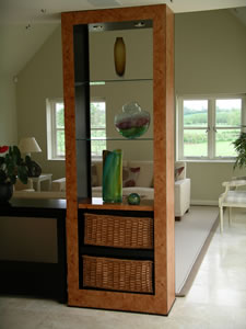 A client in Chearsley, Buckinghamshire, requested a design for a bookcase and room divider using materials of Burr Elm and Macassar Ebony with glass and ebony display shelves.
