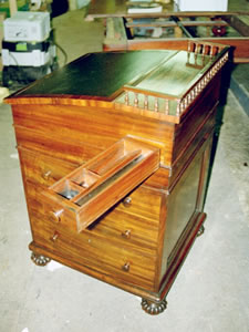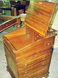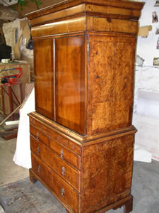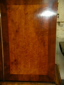 The chest was damaged due to flooding. Veneers had to be removed, pressed and dried. Then they were repositioned having been repressed using traditional glues. The veneers were then restained and polished to blend with the original walnut colour.